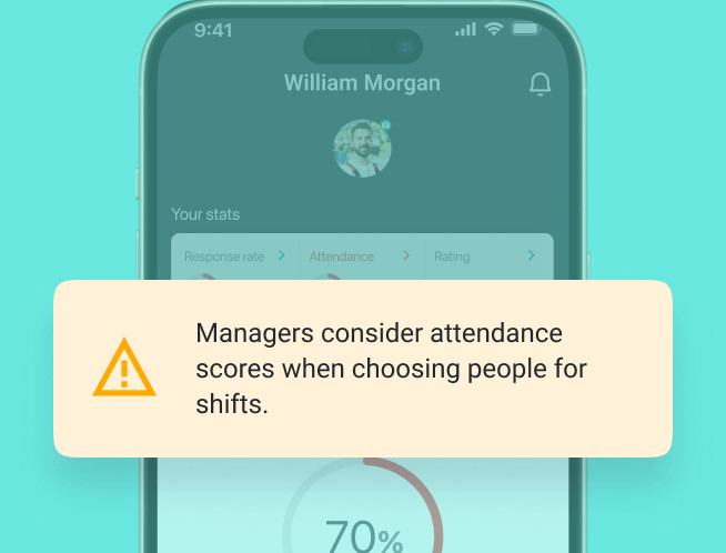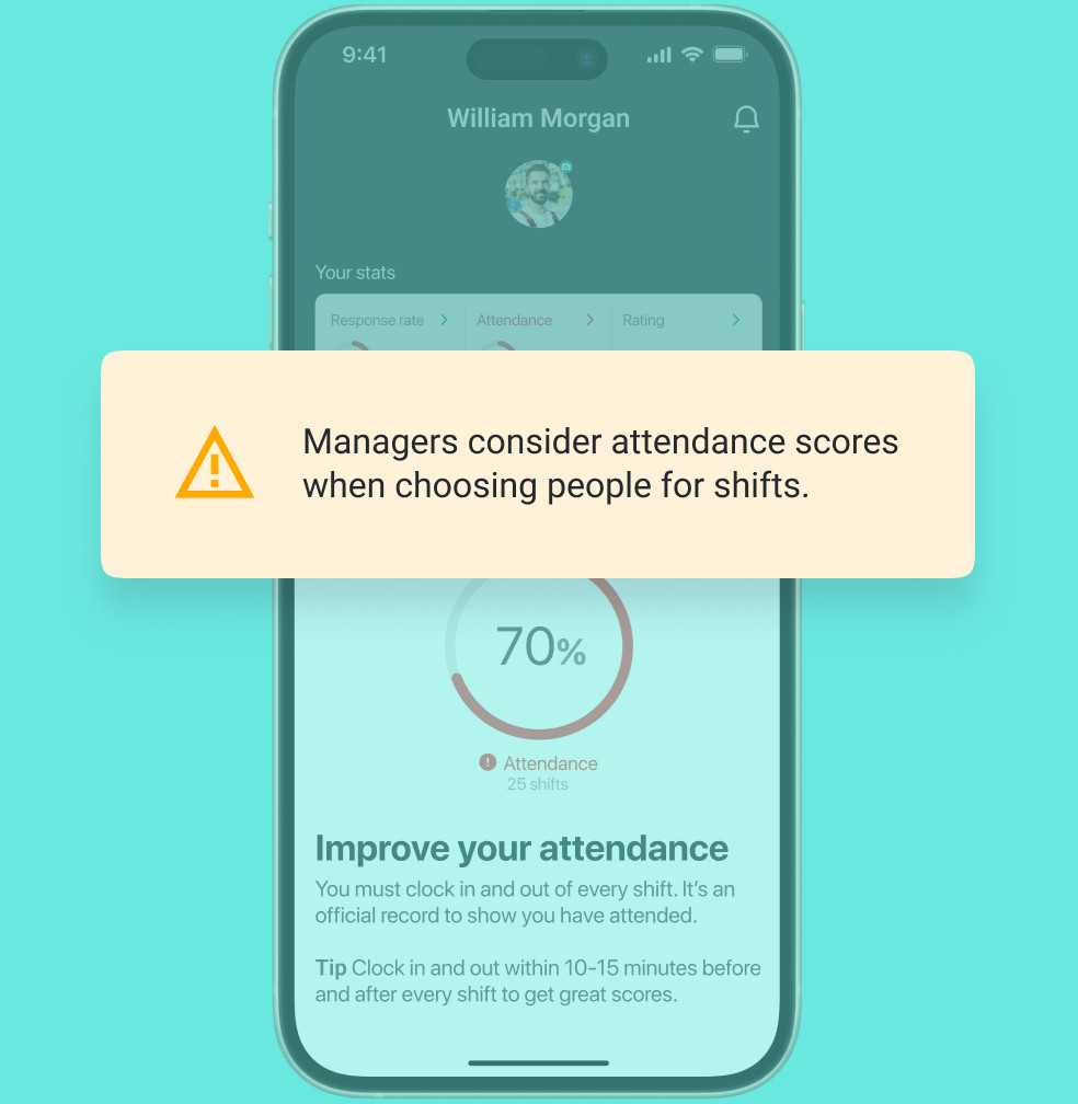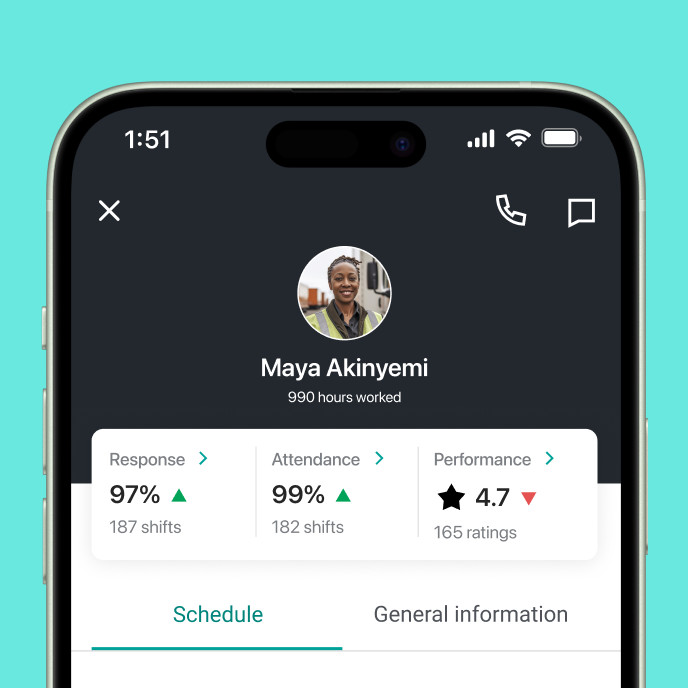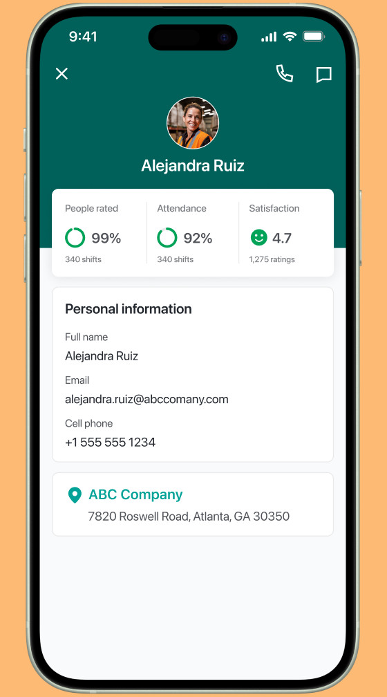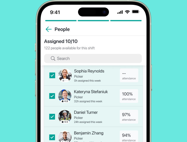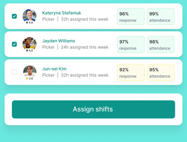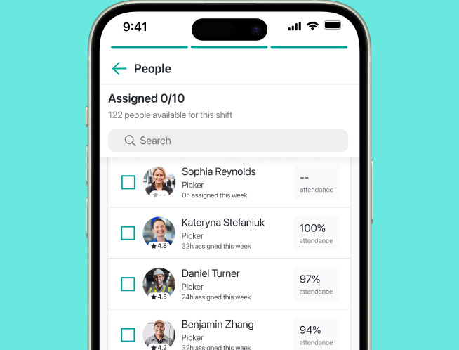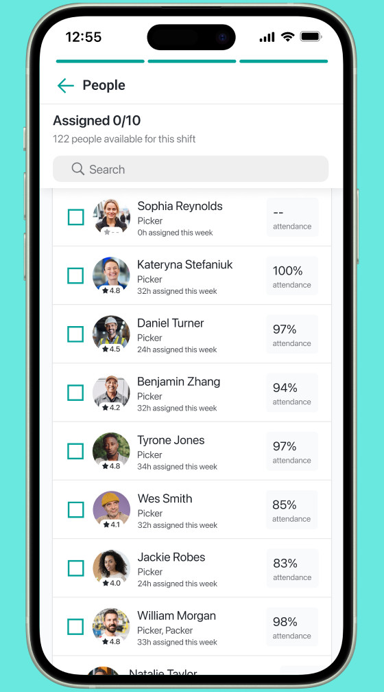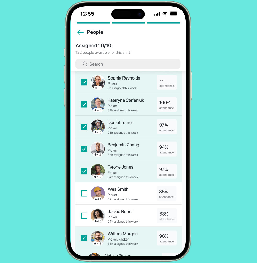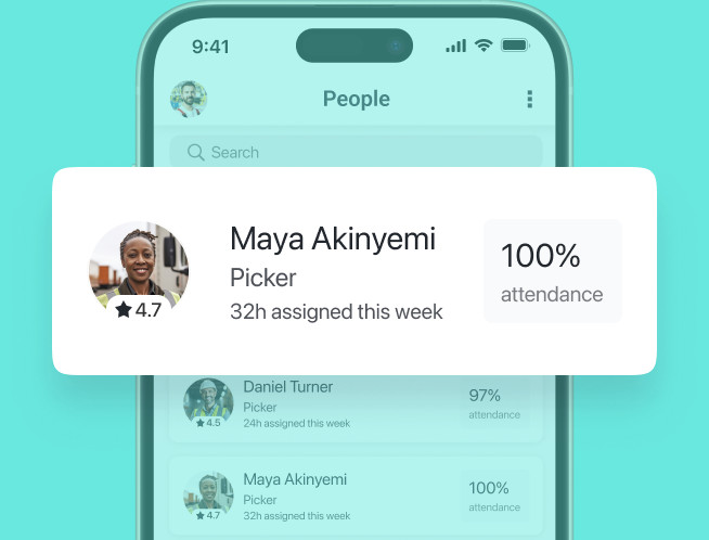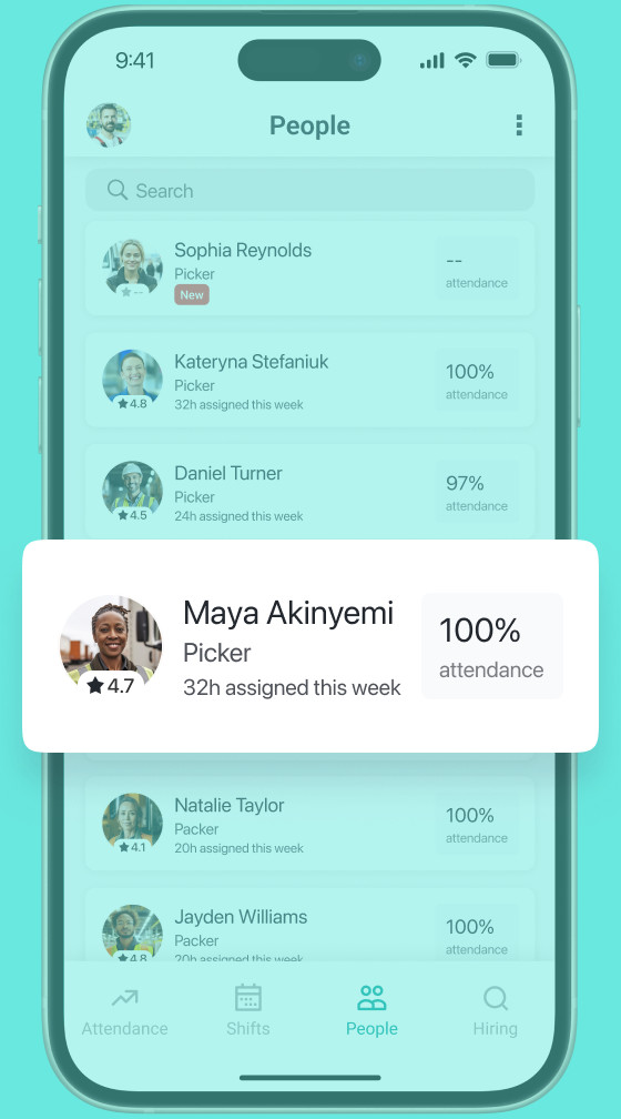 On the People tab, supervisors can view a worker’s rating, hours assigned, and attendance score. This data allows them to identify top performers and assign shifts accordingly, improving overall attendance reliability and reducing absenteeism.