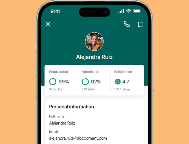 Ratings data is syndicated across the company and worker apps. This ensures workers and supervisors have access to the same information. Visual cues on the shift details screen indicate which workers have been rated and who still needs to be rated.
