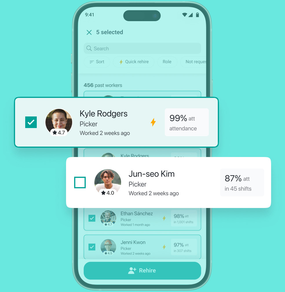Yes, supervisors can rehire past workers who have proven to be high quality and reliable. The Hiring tab shows past workers along with their key performance data, making it easy to rehire multiple workers quickly. They can also choose from a list of available people who haven't worked for them before. They similarly have ratings, attendance and response rates attached to their profiles.