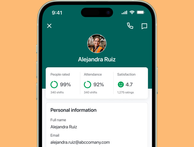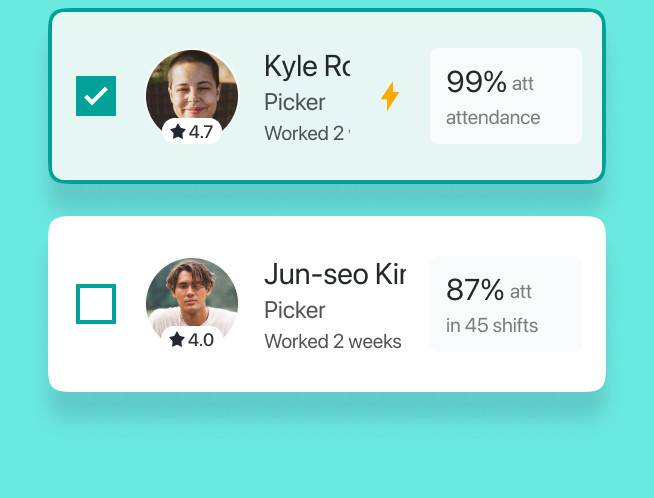 Get high quality, reliable workers fast. Simply choose who you need through the app.We show you available past workers with ratings, attendance and response rate scores. We also give you access to a pool of other available workers, all of whom can be on site in hours.